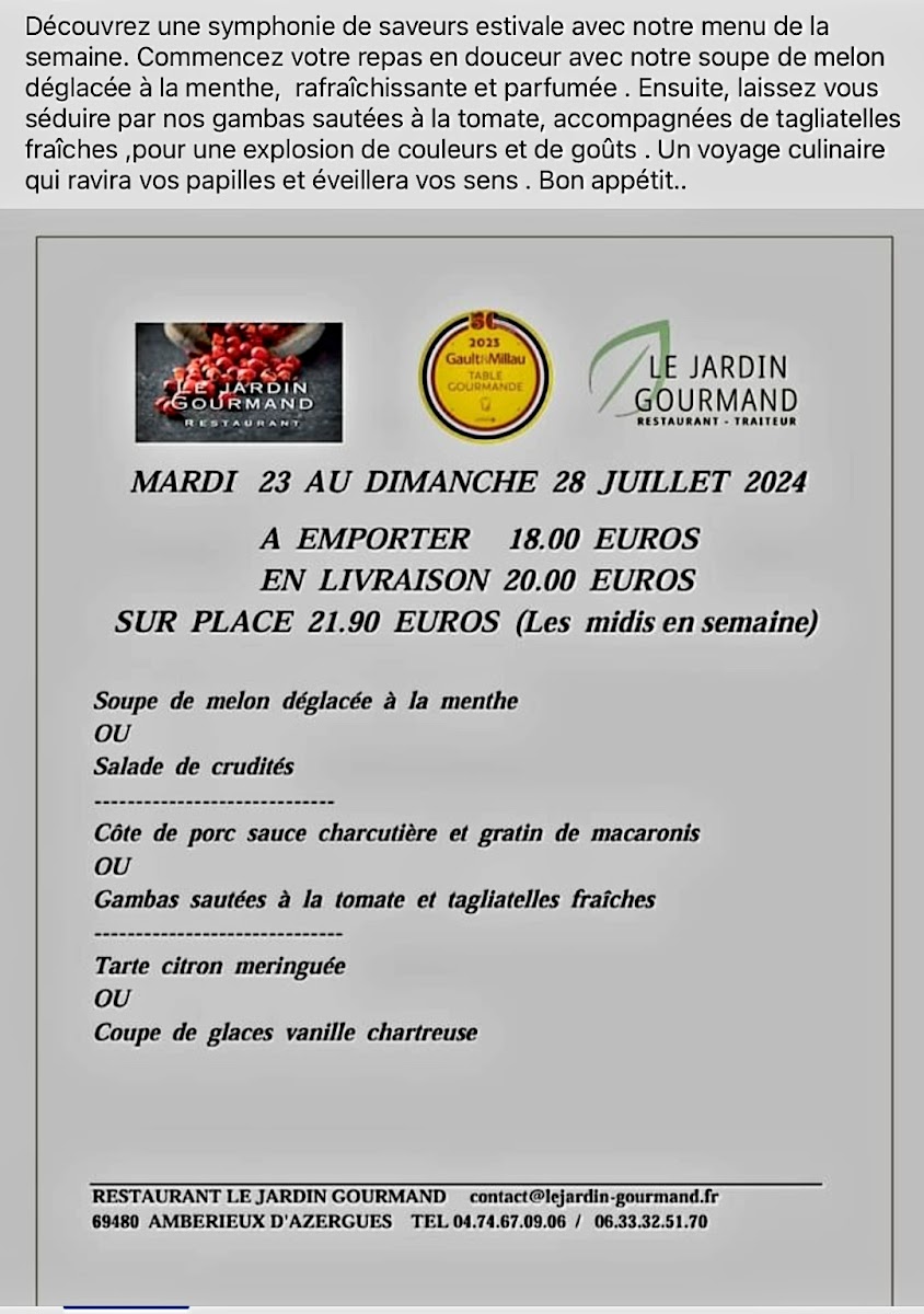 Weekly Menu Highlights: From July 22nd to 26th, indulge in the refreshing soupe de melon menthe glacée and a flavorful côte de porc en sauce charcutière, crowned by a luscious gâteau à l'ananas antillais for just €21.90.